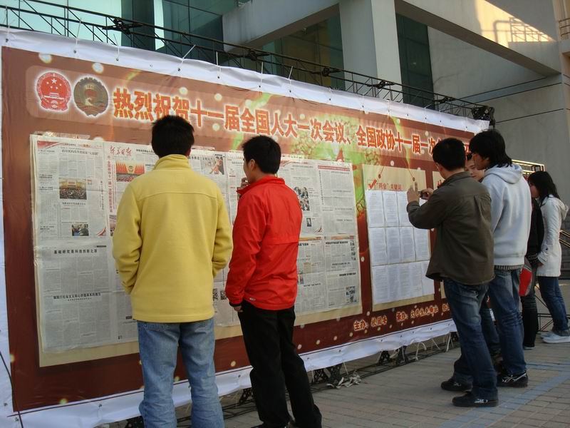 大学生先锋社的广大学生党员充分发挥党员的模范带头作用,积极投身到两会的宣传报道中来,分别通过两会报道大喷绘、校园广播台、校园学生论坛等多种形式全面宣传报道两会动态。