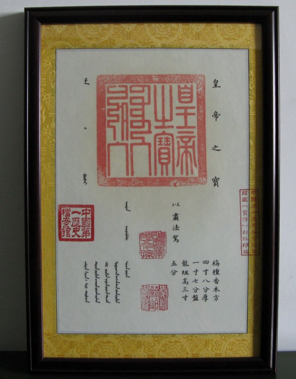 2009年3月6日,学校档案馆收到了一份极为珍贵的礼物:我校党委书记黄成惠教授,将其收藏的一幅由国家第一历史档案馆制作的清代宝玺图“皇帝之宝” 珍品捐赠给了学校档案馆。清代宝玺是研究中国印章文化和宫廷历史的重要资料,此枚“皇帝之宝”是清代二十五枚宝玺中唯一一枚檀香木制作而成的宝玺,在清代皇帝诏令文书中使用频繁,被视为清代皇权真正的标志。中国第一历史档案馆特从馆藏交泰殿《宝谱》中选出制作成图,供欣赏收藏之用。