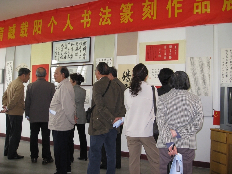 会配合此次的座谈会,4月22日上午,离退休办还特意举办了陈松育、臧载阳个人书法篆刻作品展,用艺术作品纪念南京解放60周年。江苏省老年书画研究会张秉铎会长、胡瑞清秘书长、彭荣兴副秘书长、章建宏副秘书长;江苏省民盟老龄委马凯主任;江苏省民盟老年书画会刘诗钰会长、王振逸理事;陆军指挥学院李冬青大校;校党委马家忠副书记、宣传部刘晓部长、工会徐国勋主席等领导和艺术家30余人参加了书画展开幕式,仪式由离退休工作处沙乘风副处长主持。在开幕式上,校党委马家忠副书记和江苏省老年书画研究会张秉铎会长分别致辞,充分肯定了陈松育教授和臧载阳副研究员在书法篆刻方面的造诣,号召离退休老同志将书法作为老有所乐的载体,争取在修心养性、陶冶情操的同时,让书法艺术在中医药文化的土壤中结出奇葩。陈松育教授在发言中表示将一如既往地潜心研练,争取在书法艺术上更上一层楼。