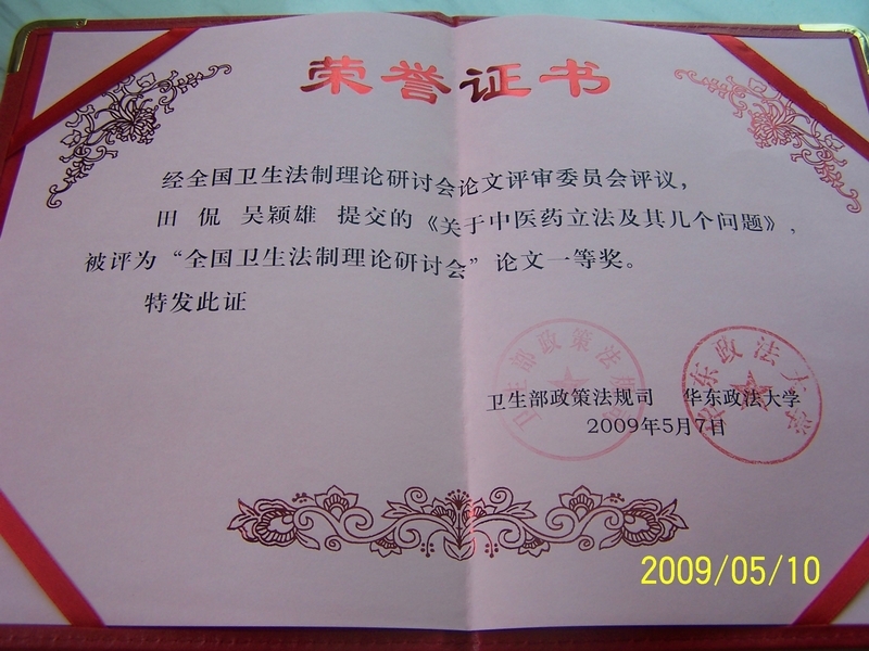 日前在上海召开的全国卫生法制理论研讨会上,我校经管院田侃教授担任主持人的国家中医药管理局中医药立法课题组的阶段性研究成果《关于中医药立法及其几个问题》,荣获国家卫生部全国卫生法制优秀论文一等奖。