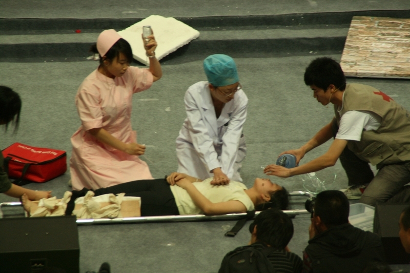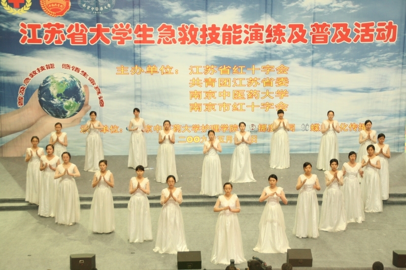 2009年5月12日,是汶川大地震的周年纪念日,也是我国第一个防灾减灾日,为了纪念5·12这一举国沉痛的日子,缅怀遇难同胞,弘扬“人道、博爱、奉献”的红十字精神和抗震救灾的伟大精神,增强大学生在突发情况下的急救意识和自我保护意识,提高对突发事件的快速反应能力和自救互救能力,由江苏省红十字会、共青团江苏省委及我校共同主办、由我校护理学院承办的江苏省大学生急救技能演练及普及活动昨天下午在我校成功举办。来自南京大学、东南大学等15所江苏高校、1500余名大学生齐聚我校体育馆,江苏省红十字会常务副会长潘宗白、江苏省高校学习实践科学发展观活动第五指导检查组组长刘健同志、共青团江苏省委沈海斌副书记、江苏省红十字会常务副会长张立明同志、江苏省教育厅体卫艺处姚志化副处长、共青团江苏省委学校部林风勇副部长等单位和部门的领导出席了本次活动。活动由我校党委副书记、副校长陈涤平主持。