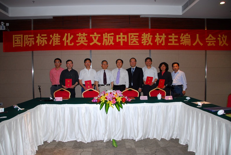 为推动中医教育在世界范围内标准化、规范化发展,经过全国高等医药教材建设研究会和人民卫生出版社历时五年的调研与论证,“国际标准化英文版中医教材”主编会议近日在北京召开。国际中医药联合会副主席,原国家中管局副局长李振吉和人民卫生出版社胡国臣社长主持了会议,并就此套英文版教材的编写意义和具体内容做了重要讲话。我校金宏柱、汪受传、严道南教授经过全国中医高校的投标角逐,一举取得推拿学、儿科学和耳鼻喉科学三部教材的主编资格。会上,李振吉和胡国臣等领导对我校积极参与教材编写和历年取得的成绩表示了赞赏和对所编教材的优秀质量给予了很高的评价,并特与我校参编人员进行了合影留念。