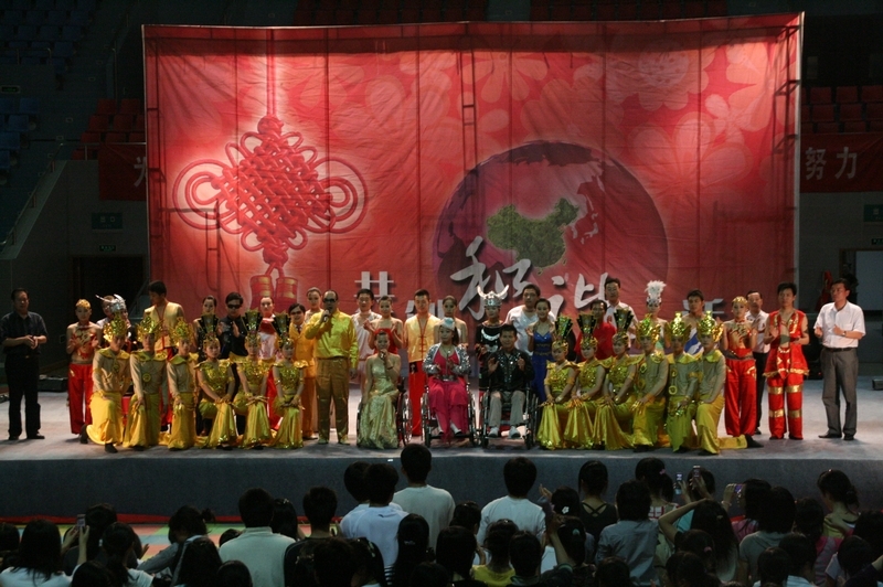 晚会在开场舞《欢聚一堂》的快乐氛围中拉开序幕,本场晚会精彩纷呈,高潮迭起。由第三届全国“德艺双馨”文艺大赛金奖得主田晓斌(盲人)演唱的歌曲《母亲》,不仅让同学们见识到了民族歌曲的魅力,更让同学们感慨万千对相隔两地的母亲更加感恩;由著名乐器歌手,毕业于长春大学特教学院音乐系的周厚国老师(盲人)表演的乐器演奏《月光下的凤尾竹》,让同学们身临其境般地感受到了浓浓的傣家风情,而其随后演唱的歌曲《我们等待的那一天》,更是让同学们欣赏到了自信的歌声、浑厚的声线以及娴熟的歌艺;由著名口技演员刘晨光(盲人)表演的口技《快乐之旅》,其惟妙惟肖的表演让在场的每一位同学惊喜不已;而大型舞蹈演出《黄土黄》则让同学们看到了黄土高原上的人们生生不息的奋斗精神;获得过2005年日本国际舞蹈大赛特别奖的郭晓双(肢残)、刘旭东(肢残)两位青年演员为大家带来的现代舞蹈《鹰之翼》让大家不仅见识到了苍鹰翱翔天际的坚毅英姿,更让同学们对两位演员克服自身困难、活力无限的精神佩服不已;情到深处,著名无臂书法家、残奥会冠军、中国书法协会会员刘军坤先生(肢残)更是挥毫写下了“精研岐黄,造福桑梓”的祝福赠予南京中医药大学的莘莘学子;而经典舞蹈《千手观音》以及有着坎坷经历却永不放弃,曾获得全国残疾人文艺汇演金奖的女歌手刘静则是拉起了晚会的巨大高潮;最后,晚会在结束曲《和谐中国》中圆满结束!