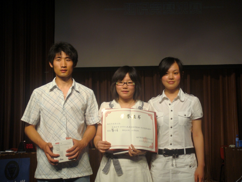 南京市第二届《中华人民共和国禁毒法》知识竞赛于617日晚在南京理工大学艺文馆举行。本次活动的宗旨为配合《中华人民共和国禁毒法》的宣传普及,迎接626日的世界禁毒日,教育广大青年远离毒品,珍爱生命。我校药学院恽菲、王绚、曹继洋三名同学代表学校取得第三名的好成绩。
