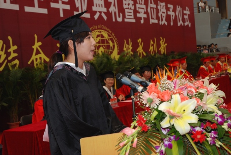 “深深母校情,悠悠学子心”。第一临床医学院仲琴同学和国际教育学院新加坡籍叶少玲同学代表全体2009届本科毕业生作了感人肺腑的发言。他们在表达对母校感激和眷恋的同时,立誓将秉承“团结奋进,继承创新”的校风,恪守“自信、敬业”的校训,勇担把中医药的博大精深传播到祖国各地、大洋彼岸的重任,将“仁德、仁术、仁人”的理念进一步传承和弘扬。