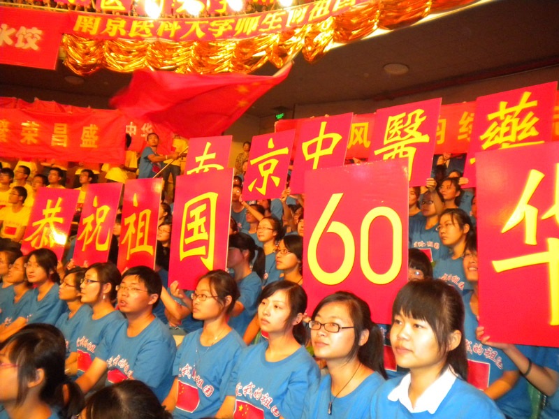 经贸管理学院从开学初接到参与方阵互动表演的任务后,妥善协调好开学初的各项工作,在校团委和院党委的领导下,在教务处、后勤处的大力支持下,由院分团委刘云龙老师具体负责,从宣传发动、人员挑选,培训、组织彩排以及后勤保障等环节进行了认真筹划,并把握进度,狠抓落实。先后共进行了6次培训及彩排,同学们每次都得坚持4个小时以上,始终以高度的政治热情、积极严谨的态度参与排练,时刻体现出南中医人迎接新中国60年大庆的拳拳挚诚。