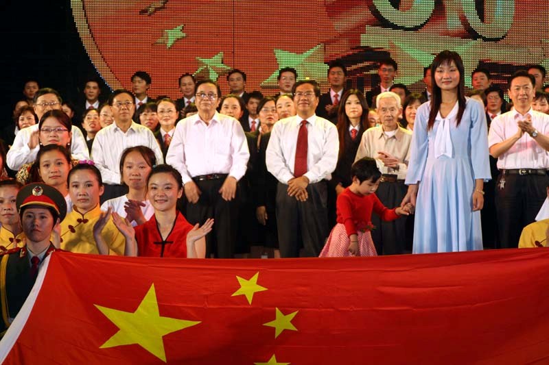 “五星红旗迎风飘扬,胜利歌声多么响亮,歌唱我们亲爱的祖国,从今走向繁荣富强……”优美的旋律响起,全场观众起立,校领导与离退休老领导健步登上舞台,与演员、观众一起引吭高歌《歌唱祖国》,歌声在会场久久回荡,晚会取得圆满成功。