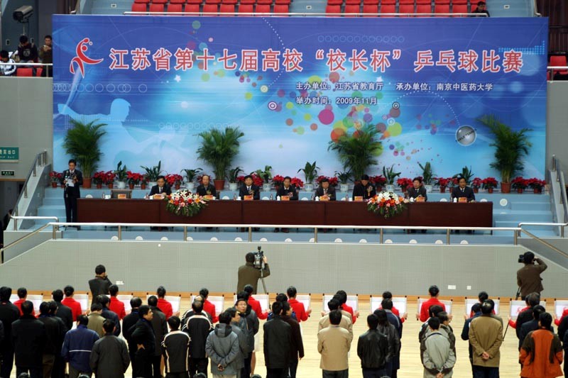 开幕式由江苏省教育厅副厅长杨湘宁主持。伴随着轻快的运动员进行曲,来自全省各高校及国家中医药管理局、省教育厅、省卫生厅的100支代表队在大会学生志愿者的引领下,迈着矫健的步伐,带着自信的笑容走进了会场。他们精神饱满,热情高涨,充分展示了当代高校领导的风采!在庄严的国歌声中,江苏省第十七届高校“校长杯”乒乓球比赛隆重开幕。