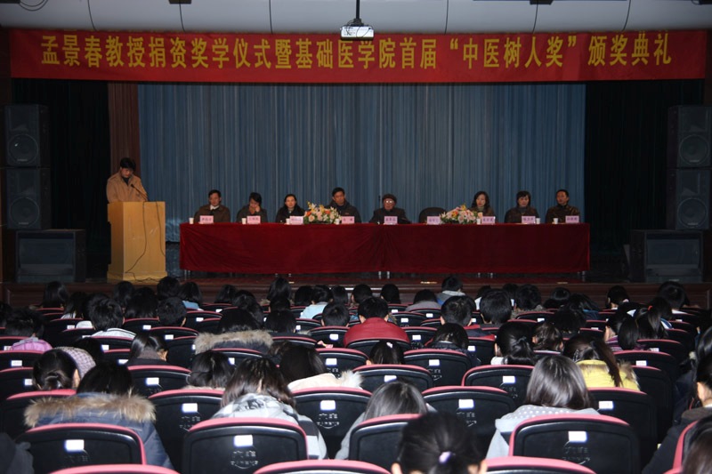 123下午440,南京中医药大学基础医学院孟景春教授捐资奖学仪式暨首届“中医树人奖”颁奖典礼在大活小剧场隆重举行。校党委马家忠副书记,有关职能部门领导,基础医学院全体院领导、班主任及同学出席了本次典礼,典礼由学院分党委书记唐德才教授主持。