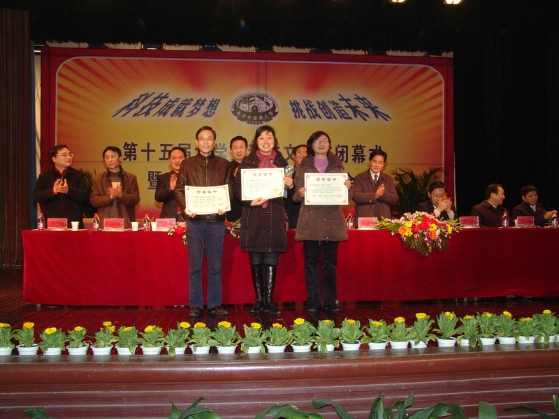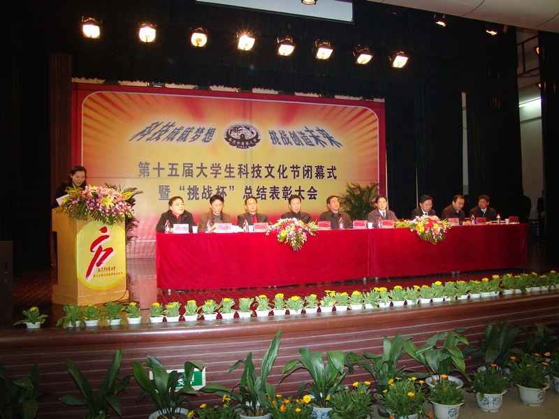 20091223下午2点,第十五届大学生科技文化节闭幕式暨“挑战杯”总结表彰大会在我校大学生活动中心小剧场隆重举行。校党委书记黄成惠教授,校长吴勉华教授,党委副书记、副校长陈涤平教授,副校长黄桂成教授,基础医学院名誉院长、南京市人大常委会副主任、大学生科协顾问黄煌教授,校科技处王中越处长,教务处刘跃光处长,学工处姚峥嵘处长,研究生院吴启南副院长,以及各学院院长和分管科技和学生工作领导,大学生科协顾问、优秀指导老师代表,“挑战杯”系列竞赛获奖集体、学生及指导老师,校学生素质拓展优秀指导老师,各学院分团委书记、指导学生学术科技活动的辅导员老师,南京大学、东南大学等在宁兄弟院校大学生科协代表,校内各学生组织负责人等出席了大会。大会由校团委郑晓红书记主持。