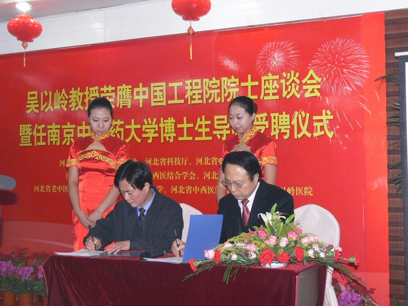 2009年12月26日下午,中国工程院院士、以岭医药集团董事长、我校杰出校友吴以岭教授在河北石家庄欣然受聘为我校特聘教授、博士生导师。我校黄成惠书记、吴勉华校长、蔡宝昌副校长、段金廒副校长以及部分职能部门、学院和附属医院领导出席了聘请仪式,并参观了河北省中西医结合医药研究院和以岭医院。聘请仪式隆重而热烈。段校长、蔡校长首先代表学校分别宣读了关于聘任吴以岭院士为特聘教授、博士生导师的决定。吴校长亲自颁发聘书,并代表母校赠送给吴以岭院士一幅金色云锦扁额。黄书记在聘请仪式上作了热情洋溢的致词。他代表全校师生医护员工热烈祝贺杰出校友吴以岭教授光荣当选中国工程院院士,并受聘为母校特聘教授、博士生导师。他指出,我校是新中国高等中医教育的摇篮,连同吴以岭教授在内,一共走出过5位院士(学部委员);在全国首届评出的30位国医大师中,曾有9位在我校任教或就读过。他表示,学校聘请吴以岭院士到母校任职,并与以岭药业建立战略联盟和友好合作关系,主要为学校事业发展寻求支持,拓展新的发展方向。他希望校企之间通过进一步加强产学研合作,共同推动中医药教育、科技、产业工作的发展。