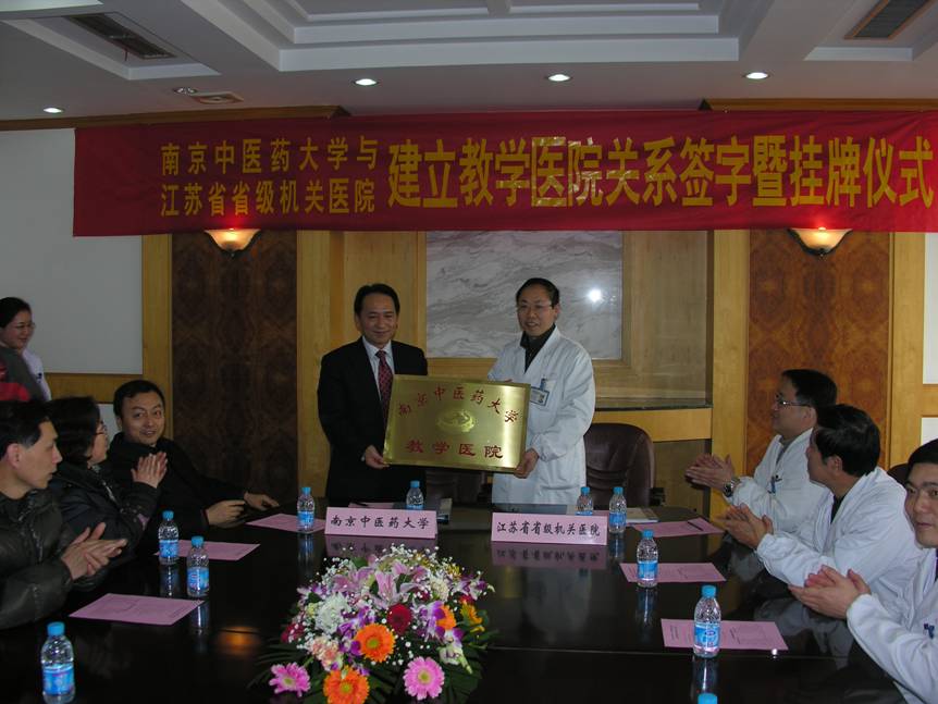 2010年1月18日下午,江苏省省级机关医院签约我校教学医院暨授牌仪式在江苏省省级机关医院会议室举行。黄桂成副校长代表学校与江苏省省级机关医院院长许家仁签订了协议书,并向江苏省省级机关医院授牌。会议由校教务处刘跃光处长主持,江苏省省级机关医院鲍军副院长、柏志松副院长、沈启松副院长、院办张粤翎主任、医务科熊亚晴科长、周卫华副科长、康复医学科徐小梅主任和江钟立主任、学校教务处徐俊良副处长、第二临床医学院唐春霞书记、顾一煌院长、张建斌副院长、康复治疗教研室王磊主任等参加了此次签约授牌仪式。