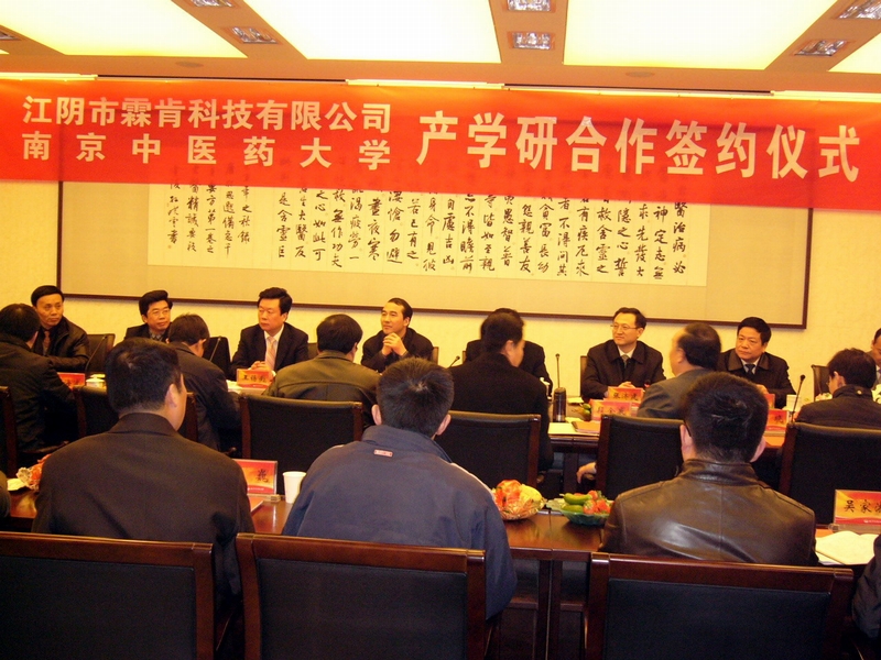 江阴霖肯科技有限公司陆文昌董事长和我校吴勉华校长、陈涤平、段金廒副校长分别代表双方在产学研合作协议、捐赠协议、产品开发技术合同上签字。根据合作协议,江阴市霖肯科技有限公司将设置1000万元人民币的专项资金,主要用于与我校联合研发以纺织新材料、纳米远红外技术为主,结合中医药保健理念的新一代理疗产品;同时该公司还向我校捐赠25万人民币,设立“南京中医药大学文昌奖、助学金”,用于奖励、资助我校基础医学院品学兼优、家庭贫困的全日制学生。