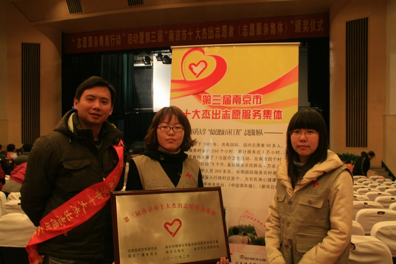 在团市委、市文明办、南京广播电视台、南京日报社、市志愿者协会联合开展的第三届“南京市十大杰出志愿者”、“南京市十大杰出志愿服务集体”评选活动中,我校“农民健康百村工程”获“南京市十大杰出志愿服务集体”称号,“农民健康百村工程”国教院台湾省籍志愿者陈韦佐同学获“南京市优秀志愿者”称号。