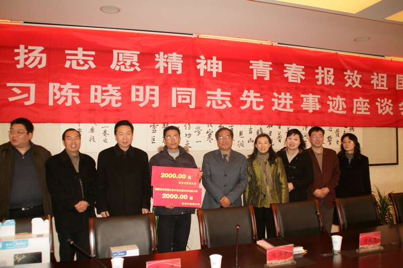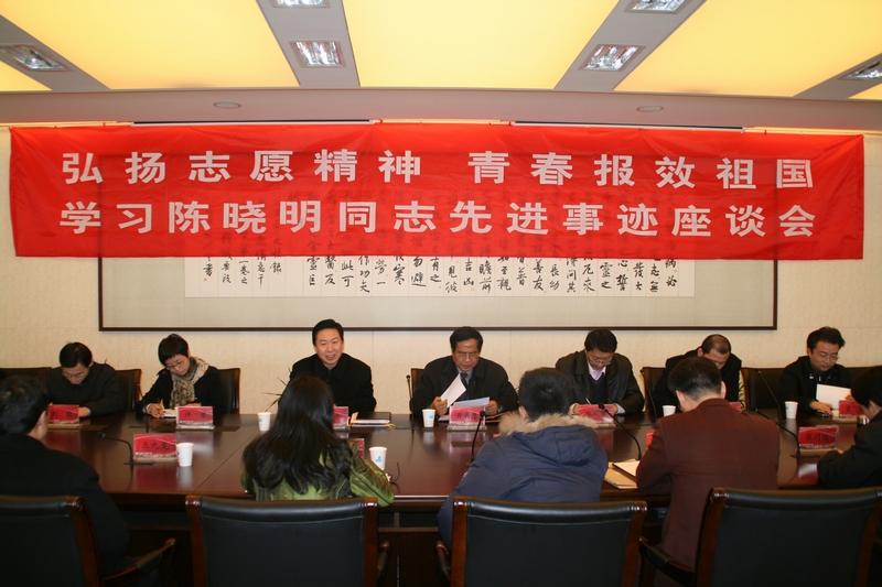 座谈会上,团委郑晓红书记、陈晓明同学大学班主任人事处施华平副处长先后介绍了陈晓明同志的先进事迹和感人故事。陈晓明同志深情讲述了自己的支教生活和情感体验,发表了自己对人生哲学的探索和感悟。与会师生对陈晓明的事迹给予了高度的肯定与赞扬,同学们纷纷表示向陈晓明学长学习,把这种对理想的执着追求和奉献社会的精神用在自己今后的学习和生活中去。团省委学校部林凤勇副部长表达了对陈晓明同志执着追求和理性思考的赞赏之情,同时也高度赞扬了我校对志愿者工作给予的高度重视和取得的成绩。校党委黄成惠书记高度评价陈晓明,称赞他:青春热血在理性的轨道上流淌。会上,黄书记还列举了吴以岒院士、陈光标先生等一批在学术上有所作为、在社会中无私奉献的我校杰出校友,认为虽然人生的体验各不相同,奉献社会的方式也各有千秋,但殊途同归,他们都有着一个共同的特点,那就是他们都有着坚定的人生信仰和美好的理想愿望,都在实实在在的工作中体现人生的价值。最后,黄书记代表母校表达了对陈晓明同志的深切祝福,祝愿他的生活更加幸福,祝愿他的人生更加精彩。