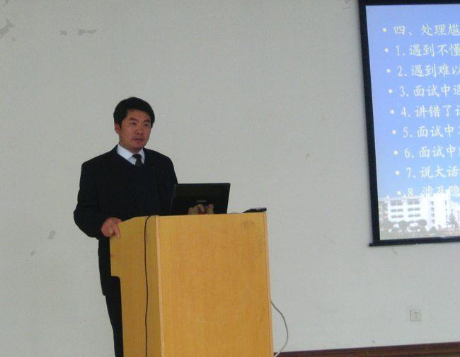 为了进一步提高我校同学的综合素质,使广大同学对“村官”有进一步的了解,校学工处于4月24日下午,特邀南京师范大学社会发展学院党委书记王新文教授在我校大学生活动中心217报告厅为广大同学举办了到村任职专题辅导讲座。王新文教授对公务员面试有着长期、深入的研究,积累了丰富的经验。本场讲座他从结构化面试的基础知识、面试时的形象礼仪、面试当中涉及的常见问题以及有关注意事项进行了系统地分析和讲解,又现场挑选了同学上台进行模拟面试,并进行了现场点评。王教授的讲座既包含大量的实用信息,又不失生动幽默,同学们不时报以热烈的掌声,现场气氛十分热烈。在聆听了王教授的讲座以后,同学们纷纷表示,王教授的讲座拓宽了自己的视野,不仅对即将到来的面试更加充满了信心,而且对自己以后的发展也是大有裨益。