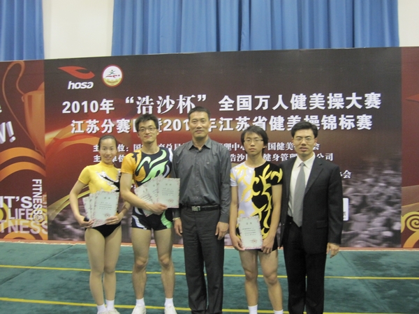 由国家体育总局主办的 2010年“浩沙杯”全国万人健美操大赛江苏分赛区暨2010年江苏省健美操锦标赛于2010年5月14-16日在南京体育学院举行,全省共37支代表队参加了比赛。由体育部夏元庆老师担任教练的校健美操队参加了四个项目的比赛。经管院的周帅岑同学获得男子单人操金牌;经管院的周帅岑和研究生院的潘纯同学获得混合双人操金牌;研究生院的潘纯同学获得女子单人操银牌;经管院的周帅岑、研究生院的潘纯和第二临床医学院的冯蕴哲同学获得三人操第四名。