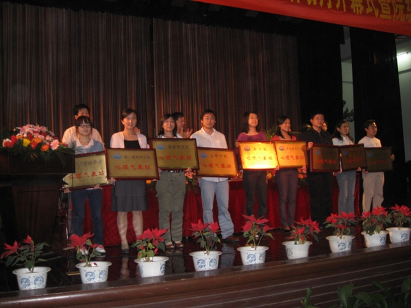 此后,举行了院级心理气象站的授牌仪式。陈书记宣读了关于授牌的决定,基础医学院等9个学院接受了授牌。院级心理气象站是我校心理健康教育的落实三级保健网络的一个重要举措,通过对心理辅导员、心理委员的定期培训,以推动全员性心理健康教育工作的开展。最后,仙林大学城心理健康教育中心周红主任做了《在压力下自由呼吸》的精彩讲座。