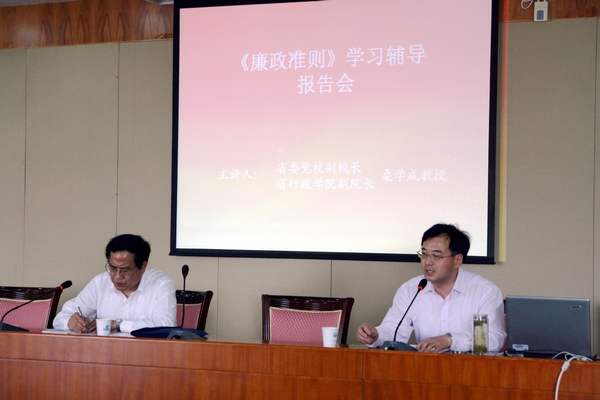 520日下午,学校邀请省委党校副校长、省行政学院副院长桑学成教授为我校中层干部、人财物等部门的科级干部作了《中国共产党党员领导干部廉洁从政若干准则》的学习辅导报告。辅导报告会由党委书记黄成惠同志主持,吴勉华校长、马家忠副书记、夏有兵副校长参加了报告会。
