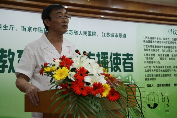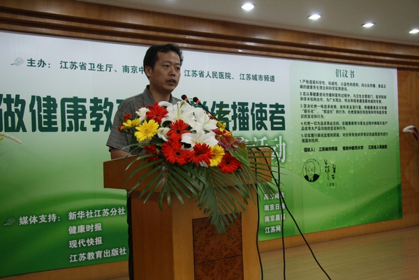 67下午2点,由江苏省卫生厅、南京中医药大学、江苏省人民医院、江苏城市频道、江苏健康广播五家联合主办的“做健康教育的科学传播使者”倡议活动和专题研讨会在我校汉中门校区8号楼报告厅举行。我校夏有兵副校长、江苏省人民医院王水副院长和占伊扬主任、江苏城市频道张建赓总监、江苏健康广播的峁晓明总监等领导出席仪式,同时邀请了我校王旭东、金宏柱、杜文东、王启才四位教授及江苏省人民医院临床营养科李群主任等组成专家团。到场的还有南方周末、现代晚报、扬子晚报、金陵晚报、南京晨报等多家合作媒体记者及百余位现场观众。