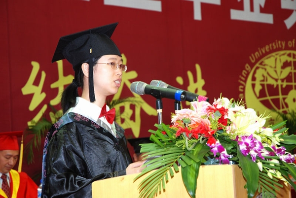 “深深母校情,悠悠学子心”。药学院裴子凡同学和国际教育学院韩国籍崔无穷同学代表全体2010届本科毕业生作了感人肺腑的发言。他们在表达对母校感激和眷恋的同时,立誓将秉承“团结奋进,继承创新”的校风,恪守“自信、敬业”的校训,勇担把中医药的博大精深传播到祖国各地、大洋彼岸的重任,将“仁德、仁术、仁人”的理念进一步传承和弘扬。
