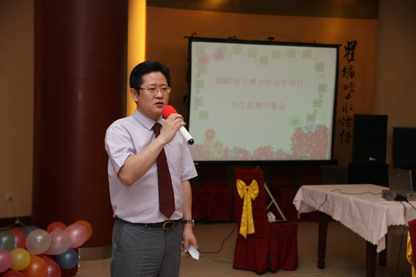 2010年7月2日18:00,由我校中澳合作办学项目管理委员会主办、澳大利亚教育管理集团承办的2007级中澳合作办学项目学生赴澳欢送会在我校杏苑宾馆隆重举行。黄桂成副校长、国际合作与交流处戴慎处长、教务处刘跃光处长、学工处姚峥嵘处长,澳大利亚教育管理集团中国区总裁