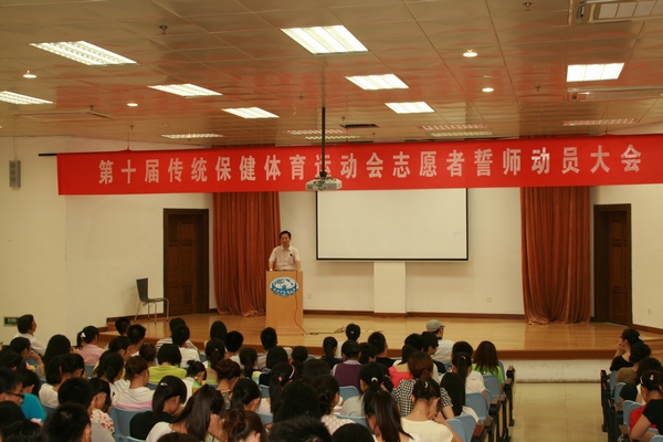 会上,陈涤平副书记做了重要讲话。他首先向全体志愿者介绍了我校承办此次传统保健体育运动会的重要意义和运动会的基本概况,随后与大家分享了四点感受:一是认为此次传保运动会是我校发展历史上的一次盛会,是我校五十年办学水平的体现,是我校一万五千名大学生优良素养和青年精神的展示,也是江苏文明和悠久文化的一次展示;二是认为高校要引进现代大学文化,鼓励大学生们更加注重自身素质的培养和拓展,积极参与学校的管理、服务和各项活动,让志愿服务这样的体验成为人生发展的加油站和助推剂;三是报名参加志愿服务是同学们志愿精神的一种体现,也是同学们给学校的一份承诺,做好志愿服务工作是每一位志愿者义不容辞的责任,全体志愿者要树立更高的责任感,一同完成学校给国家中医药管理局、全国各地中医药院校的这份承诺;四是从每一位志愿者身上都能折射出南中医学子的形象,代表学校的风貌,每一位同学都要以昂扬的姿态投入训练、演出和接待工作,一切行动听指挥,共同努力,圆满完成各项任务,将南中医最美好、最深刻和最难忘的印迹镌刻在每一位来宾的心中。