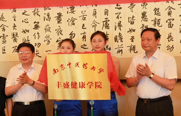会议中还随即举行了校企合作办学的签约揭牌仪式,王国强副部长、殷翔文副厅长与吴勉华校长、康缘药业集团总裁萧伟一起揭开了“康缘中药学院”铜牌,康缘集团每年将提供300万元用于康缘中药学院的人才培养,使之努力办成中国最好的中药学院,设立基金总额1600万元,用于创新产品研发;王国强副部长、吴坤平副厅长与吴勉华校长、丰盛集团董事长季昌群先生一起揭开了“丰盛健康学院”铜牌,丰盛集团拟在我校建设16000㎡的“丰盛楼”,作为丰盛健康学院的教学、科研、办公用房,将丰盛健康学院建设成为全国一流融养生、保健、教育、科研、人才培养为一体的基地。王国强副部长、省台办主任陈尧与吴勉华校长、台湾联望集团总裁赖宥嘉总裁揭开了“联望动漫科技学院”铜牌,联望集团拟将中医药资源引入动漫产业,同时为中医药健康产业的普及、推广搭建更为便捷的载体和平台。