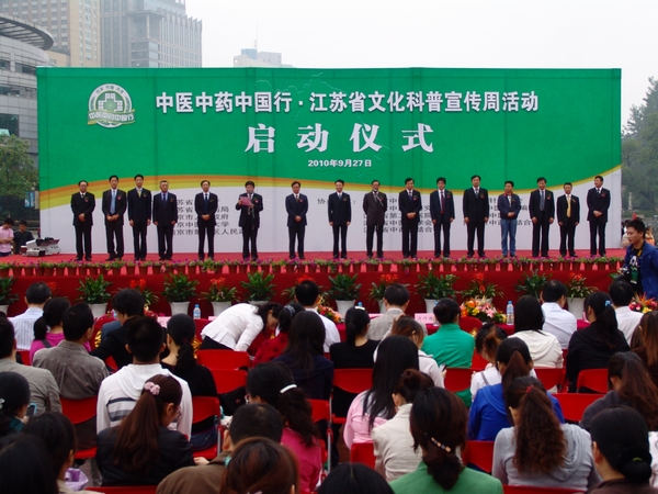 金秋九月,杏林飘香。927日,中医中药中国行·江苏省文化科普宣传周活动在南京市山西路广场隆重启动。此次活动由我校与江苏省卫生厅、江苏省中医药局、南京市人民政府、南京市鼓楼区人民政府等单位联合主办。我校承担宣传周启动仪式的总策划、总协调,以及文艺演出、志愿者推拿服务、氛围营造等工作。几千名市民参与了现场活动,领略了中医药的独特魅力。启动仪式上,省卫生厅厅长郭兴华致辞,副省长何权宣布活动启动,我校党委马家忠副书记出席启动仪式。
