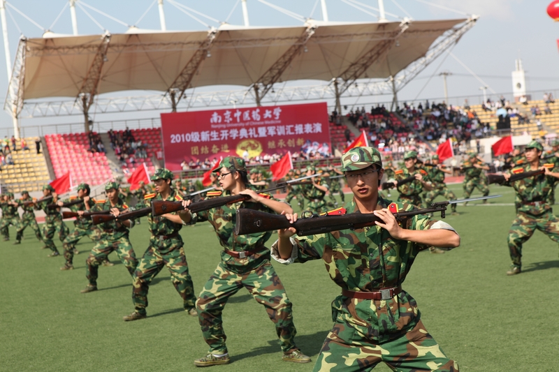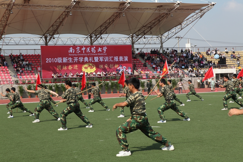 在军训汇报表演上,我校女子国旗班首先举行了庄严的升旗仪式。校党委黄成惠书记检阅了各受阅方队。在雄壮的分列式进行曲中,由2400余名2010级新生组成的20个受训方队和国旗班方队迈着矫健的步伐,精神抖擞地正步走过主席台。同学们以严整的军容、整齐的步伐、响亮的口号、蓬勃的精神风貌展示了半个月来刻苦训练的成果,赢得了学校领导、承训单位首长和在场师生员工的阵阵掌声。分列式表演后,同学们还进行了叠军被、队形变换、格斗拳、棍术、军体拳、刺杀操表演。
