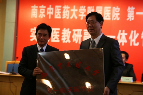 会上,吴勉华校长代表学校宣读了《南京中医药大学关于附属医院与第一临床医学院实行医教研融合一体化管理的意见》。黄成惠书记在随后的讲话中表示,医教研融合一体化管理对于促进学校和附院医教研的水平乃至推动全省中医药事业的高水平发展,具有十分重大的现实意义和深远的历史意义,并就相关实施工作提出了三点具体要求:一是要进一步明确医教研融合的重大意义,统一思想,形成一致的观念和目标取向;二是要坚持积极推进、稳妥实施的方针,切实做好医教研融合的各项实施工作;三是要加强组织领导和思想工作,为医教研融合平稳实施提供组织和思想保证。刘沈林副校长在发言中要求附院的广大医护员工进一步增强投身医教研融合工作的自觉性和责任感,热情帮助第一临床医学院的师生尽快适应和融入新的工作环境当中,充分发挥主体性和积极性,切实做好初始阶段的各项实施工作,为下一步工作的顺利开展积极创造有利条件。最后,省卫生厅副厅长、中医药局局长陈亦江向学校和附院的师生、医护员工们表示了热烈的祝贺,并要求学校和附院以此为契机,进一步协调处理好医疗、教学、科研、管理之间的关系,在管理体制、运行机制和培养模式上大力改革创新,真正做到优势互补、相辅相成、协同发展、共同提高,共同构建一个更加符合高等中医药学教学发展和人才培养、大学和医院互利共赢的发展格局,为江苏中医药事业发展做出新的更大的贡献。