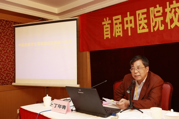 中华中医药学会翻译分会副主任委员兼秘书长丁年青教授则报告了上海中医药大学的大学英语教学改革项目—“构建中医院校学生英语综合应用能力培养——‘三位一体’教学模式”。丁年青教授从上海中医药大学的实践出发,和大家分享了他们英语教学的目标和方向,即以公共英语为基础,专业英语为桥梁,实现用英语进行有效专业交流的目标。该校通过制定大学外语教学基础阶段的网络教学到提高阶段的“菜单式”课程教学的培养方案,对大学英语教学进行了积极的改革探索,为其他中医院校相应的教学改革提供了经验和借鉴。
