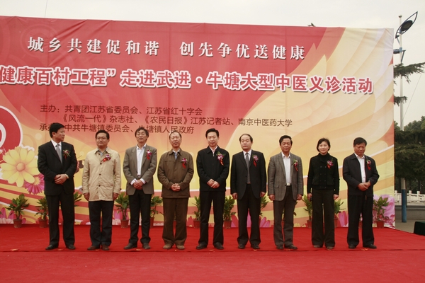 此次“农民健康百村工程”走进牛塘活动,也是江苏省“一村官一项目工程”的典型项目,我校2009届毕业生步鑫同学在牛塘镇担任大学生村官后,投入基层工作,了解群众需求,结合自身专业知识,在团区委、镇党委的大力支持下,联系母校,开展了此次“农民健康百村工程”走进牛塘活动。各主办方及各界领导给本次活动给予了极大关注,服务团在牛塘镇期间,江苏省红十字会常务副会长潘宗白,南京中医药大学党委副书记、副校长陈涤平,团省委宣传部部长周永忠,武进区委常委、组织部长黄汉林,常州市红十字会常务副会长俞坚,共青团常州市委书记胡竹等省、市、区、镇相关领导于