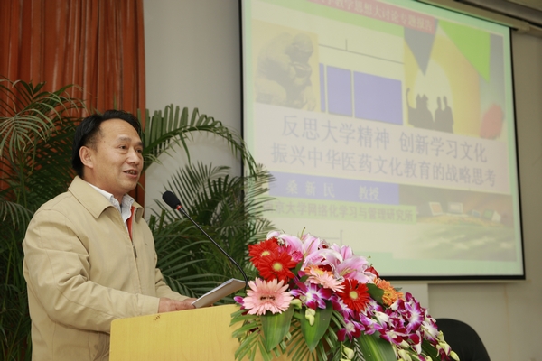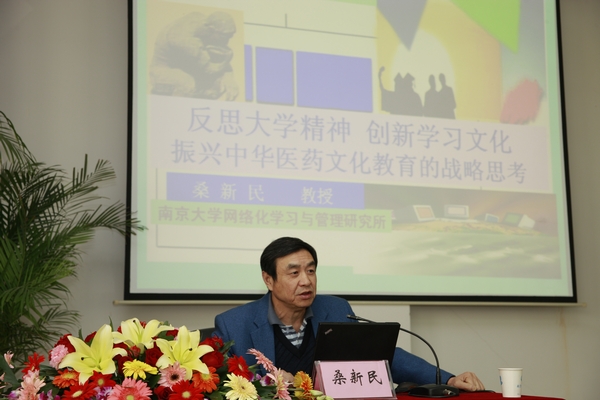桑新民教授的报告结合我校实际从四个方面展开:高校课程教育面临的挑战和机遇,全球化视野中的教育信息化新思维,反思大学精神、创新学习文化,以及振兴中华医药文化教育的战略思考。桑教授认为我国高校课程教学面临的时代挑战主要有信息化和国际化的冲击,扩招后师生比加大导致的课程资源紧缺,以及学科专业调整后,迫使老专业加大课程改革创新力度,新专业大量开办,课程建设、管理和评价的复杂性和难度都大大增加。而信息技术与教育的结合,将会给教育带来革命性的变革。桑教授透过全球高等教育信息化的新景观看到世界名牌大学纷纷创建学习与课程教学支撑服务体系,这为我国高校教育信息化提供了新思维。在谈及大学精神时,桑教授从中国传统意义上的大学,西方大学精神以及中国近现代大学的理念说起,提出了大学必须拥有大师、大境、大士、大业的观点,要想扭转当前社会之异化、大学之异化,需要“综合治理”,而且非短期所能见效。大学领导和教师必须让大学生领略大学文化之精髓,引导大学师生寻找失落的大学精神。帮助大学师生选择和确立人生的理想、目标、志向,为今日之学者与学子铸造心灵之家园、学术之慧命、文化之灵魂。在探究学习内涵时,桑教授指出要让学生学会学习,培养信息时代的创造性学习能力,形成带得走的能力。在作振兴中华医药文化教育的战略思考时,桑教授将中医药事业的发展与信息技术现代化紧密联系起来,创造性地提出创建网络中华医药文化大学堂的观点,为我校的发展提供新的思路。