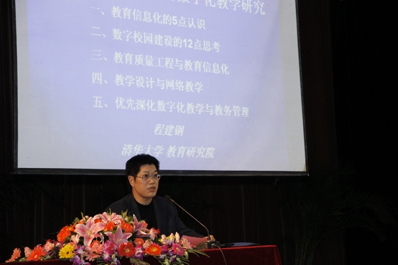 工作会上,清华大学程建钢教授作了题为“高等教育信息化与数字化教学研究”的专题报告,报告主要从教育信息化的认识、数字校园建设的思考、教育质量工程与教育信息化、教学设计与网络教学、优先深化数字化教学与教学管理五个方面进行阐述,突显了教育信息化不仅仅是教育设备、教育手段的改变,更是教育思想、教育观念和教学结构、教学模式的转变。随后清华大学教育研究院教育技术研究所数字化学习与管理推进中心的位文远老师介绍了“清华在线”课程中心平台的基本功能及使用情况,为我校课程中心的应用起到了很好的引导作用。