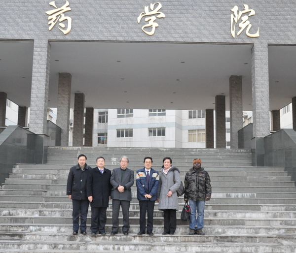 蔡宝昌教授(左二)、药学院副院长陈建伟教授(左一)与服部教授(左三)及济木教授(左四)在我校药学院门口合影留念
