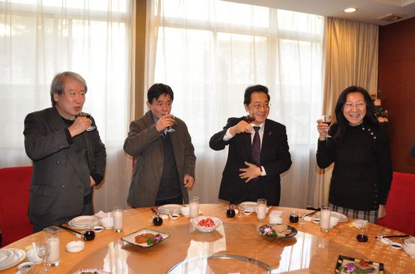 服部教授(左一)、校长吴勉华教授(左二)、济木教授(左三)及我校国际教育学院副院长张旭教授(右一)举杯共祝两校合作成功