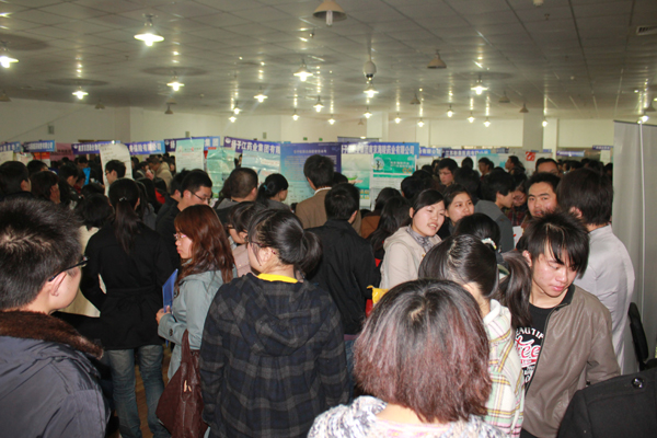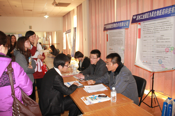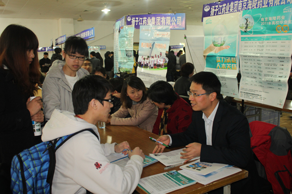 2011年3月12日下午,由我校大学生就业创业指导中心主办、各学院协办的2011届毕业生春季供需洽谈会在我校仙林校区体育馆成功举行。本次供需洽谈会共吸引了医院16家、制药企业40家、生物高新技术企业17家、软件企业5家、其他行业企业32家,共110家单位参会,为毕业生提供就业岗位1100余个。其中苏州新加坡工业园区生物纳米园17家高新技术企业组团到我校招聘成为此次招聘会的一大亮点。共有校内外毕业生1500多人进场洽谈,还有部分在校生也未雨绸缪,到招聘会现场了解就业情况。学校学生处领导、各学院分管书记等大学生就业创业指导委员会成员、各学院就业创业指导老师、各毕业班班主任均到场指导,并积极向用人单位推介我校毕业生。