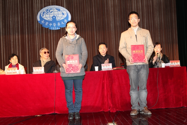 颁奖典礼上,马家忠副书记宣读了《南京中医药大学2010年度朱敬文奖学金表彰决定》。朱敬文特别奖学金获得者朱晓蕾博士,朱敬文奖学金获得者姚沈晗同学分别代表研究生和本科生获奖同学作了获奖感言。