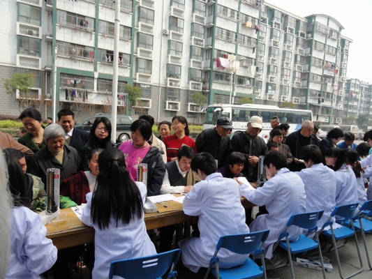 为贯彻落实科学发展观,深入开展“创先争优”活动,同时也为更好地服务群众,弘扬中医文化,南京中医药大学机关党委教职工二支部与第一临床医学院党委学生三支部于2011410日开展了“春暖公益路,中医中药行——走进江宁天景山社区大型义诊活动”。第一﹑第二临床医学院七位义诊专家,机关党委二支部教师代表李新路﹑周洋老师,一临学生三支部的支部书记胡士平老师,副书记张裕强老师以及校五星级学生社团服务百居中心成员参加了此次师生支部结对共建活动。