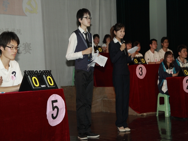 作为比赛序曲,6位同学给大家带来了耳熟能详的红歌,经典的旋律让人想起了全国人民共同奋斗的艰难岁月,爱国之情油然而生。刘晓部长发表了精彩致辞并宣布比赛正式开始。比赛中,选手们运筹帷幄,谨慎思考,巧妙作答,赢得场下观众阵阵喝彩与掌声,经过必答题、简答题、互问互答、观众提问等诸多环节的激烈角逐,2010级中医专科3班“星光”队最终力压群雄,摘得桂冠,2009级中医专科3班“先锋”队、中西医临床2班“爱国”队分获第二、第三名。朱尧和薛群两位获得“优秀选手”的称号。
