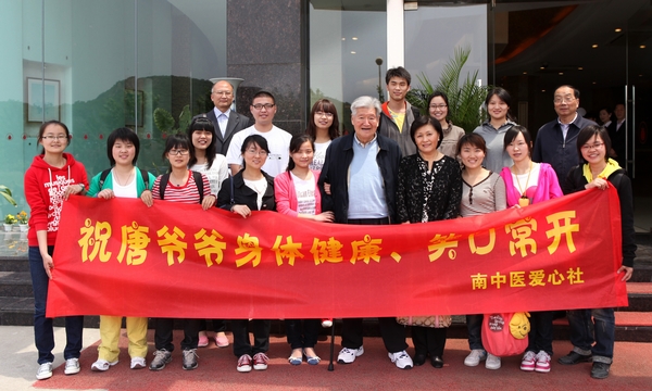 校党委黄成惠书记代表全体师生对唐先生的来访表示热烈欢迎,并对唐先生长期以来坚持捐资助学,对我校事业发展尤其是对中医药研究的关心和支持表示衷心感谢。汇报会上,陈涤平副书记和段金廒副校长分别就“唐仲英德育奖学金”运行情况和唐仲英科技楼暨江苏省中医药研究与新药创制中心建设情况做了汇报。唐先生不时询问,对我校近5年来取得的成绩表示充分肯定。汇报会后,唐先生一行在黄书记、吴校长陪同下参观了唐仲英科技楼。抵达杏苑宾馆后,唐先生受到了我校爱心社同学们自发的欢迎,在同学们敬献的鲜花和“唐爷爷好”的亲切问候声中,唐先生愉快地和同学们合影留念。