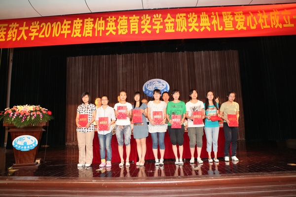 颁奖典礼上,学工处姚峥嵘处长宣读了《关于表彰南京中医药大学2010年度唐仲英德育奖学金获得者的决定》。主席台领导为获奖学生代表颁奖。2010年唐仲英德育奖学金获得者、第一临床医学院尹洋同学,爱心社副理事长、基础医学院尹鑫同学分别代表30名获奖同学和爱心社发言。