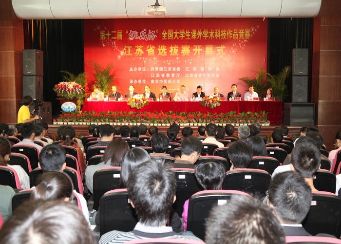 201152414:00时,我校大学生活动中心小剧场内座无虚席,济济一堂,由团省委、省教育厅、省科协、省学联等单位联合主办的第十二届“挑战杯”全国大学生课外学术科技作品竞赛江苏省选拔赛开幕式在这里隆重拉开序幕,中国工程院院士蒋士成先生,总参63所总工程师寿福明,江苏省社科院院长、刘志彪教授,团省委副书记沈海斌,江苏省教育厅学生处副处长张兆臣,江苏省科协学会部部长许钧等领导,以及来自南京大学、南京师范大学、南京邮电大学、南京财经大学等八所在宁高校的师生代表应邀出席了当天的开幕式。开幕式由团省委学校部部长俞锋主持。
