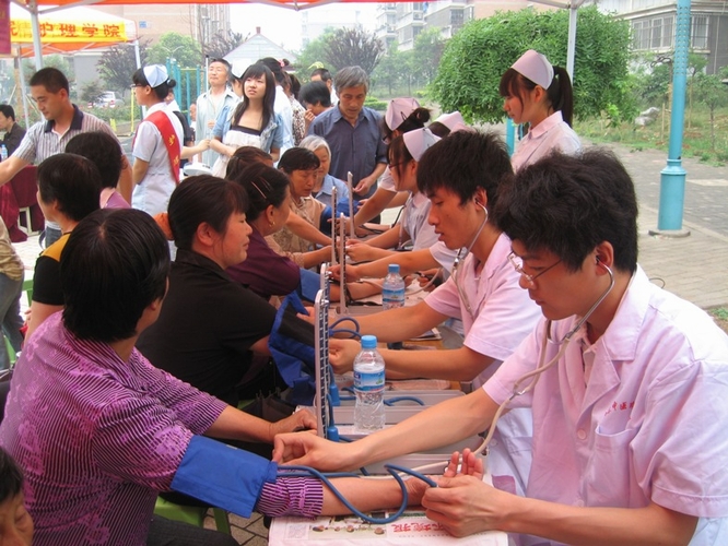 挂牌仪式结束后,义诊活动拉开了序幕,养心社的同学们给居民们带来了中医养生特色的八段锦表演和太极拳表演,专家义诊展台前挤满了前来咨询和就诊的居民,专家们热情细致地为居民诊疗,让居民们不出社区就能体验专家级服务,家庭护理急救社的同学们开展健康知识宣教,发放宣传册,推拿小分队的推拿服务也广受居民的欢迎。活动持续了近三个小时,现场气氛高涨,同学们忙得不亦乐乎,居民们也满意而归。