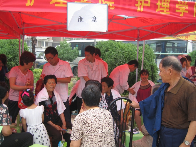 201164,护理学院“情牵西岗、爱系居民”实践基地挂牌仪式暨义诊活动在西岗街道听竹社区隆重举行。本次活动是南京中医药大学2011年度“最佳党日活动”立项资助方案的重点方案,也是护理学院党委开展“创先争优、服务社会、天使西岗行、健康你我他”——西岗街道志愿服务系列主题党日活动的重要活动之一。西岗街道党工委庄荣副书记、武装部殷凤斌部长,护理学院党委书记姚小平,校组织部、统战部曹凯副部长,护理学院党委王红云副书记、护理学院陈璇副院长等领导出席了仪式。中医临床专家姚映芷教授、推拿专家冀斌副教授、心理咨询专家黄爱国老师、临床护理专家孟娣娟老师等名医专家参加了义诊活动。