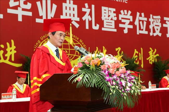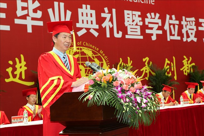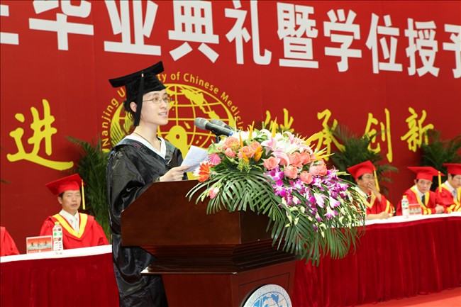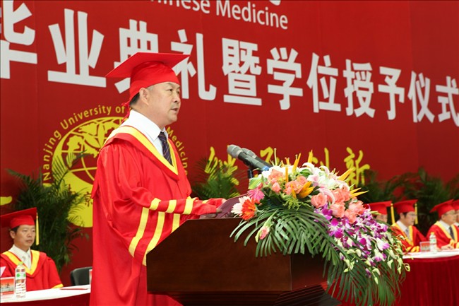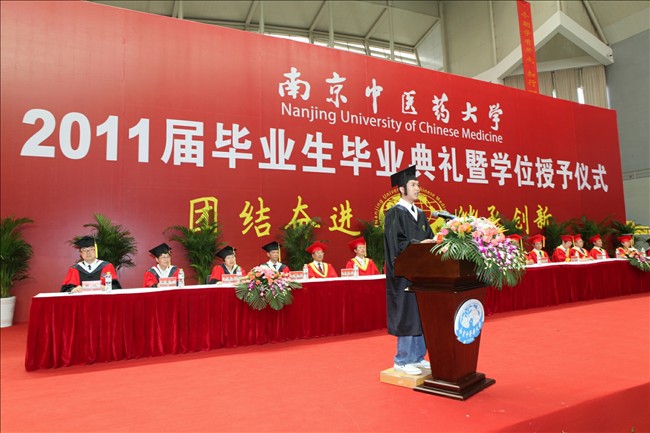 在毕业典礼暨学位授予仪式上,校长、校学位委员会主席吴勉华教授寄语毕业生要学会生存、端正做人、不断求知、努力发展,用自己的双手去开创美好的明天。副校长、校学位委员会委员段金廒教授宣读了《2011届优秀毕业生表彰决定》。副校长、校学位委员会委员黄桂成教授宣读了《学位授予决定》。南京中医药大学2011年大学生最喜爱的老师-药学院李祥教授,国家奖学金和校长特别奖获得者、校三好学生、优秀毕业生-第一临床医学院陈婕同学,国际教育学院马来西亚籍林衍志同学分别代表教师和毕业生发表了热情洋溢的讲话。随后,校领导和校学位委员会委员为2800名毕业生逐个颁发了学位证书、授予学士学位。
