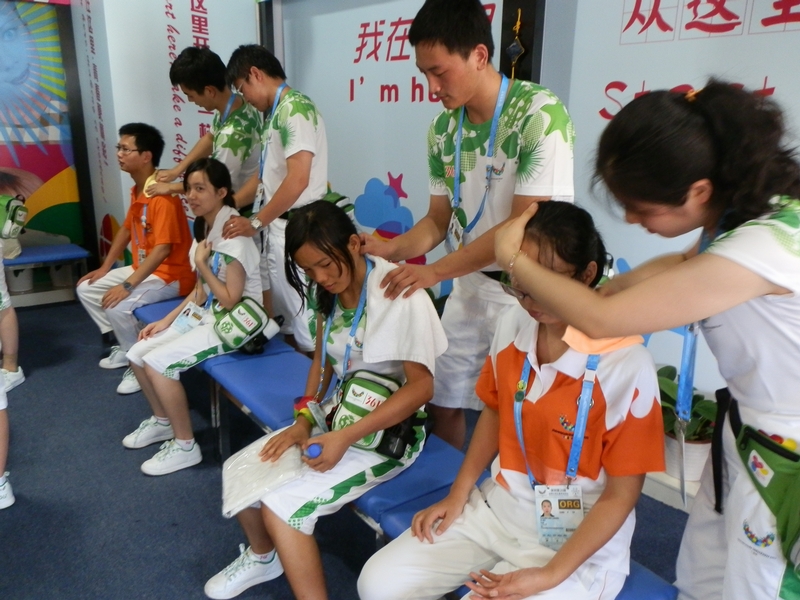 在繁忙的工作间歇,我校志愿者们也不忘把握住机会向全世界大学生们和全国的志愿者们展示中医药无穷的魅力,首推“特色志愿服务中队服务”活动,在场馆U站为大家进行推拿、面部美容、健康咨询、太极拳传授等中医特色服务,受到了全国学联和深圳团市委领导的好评。