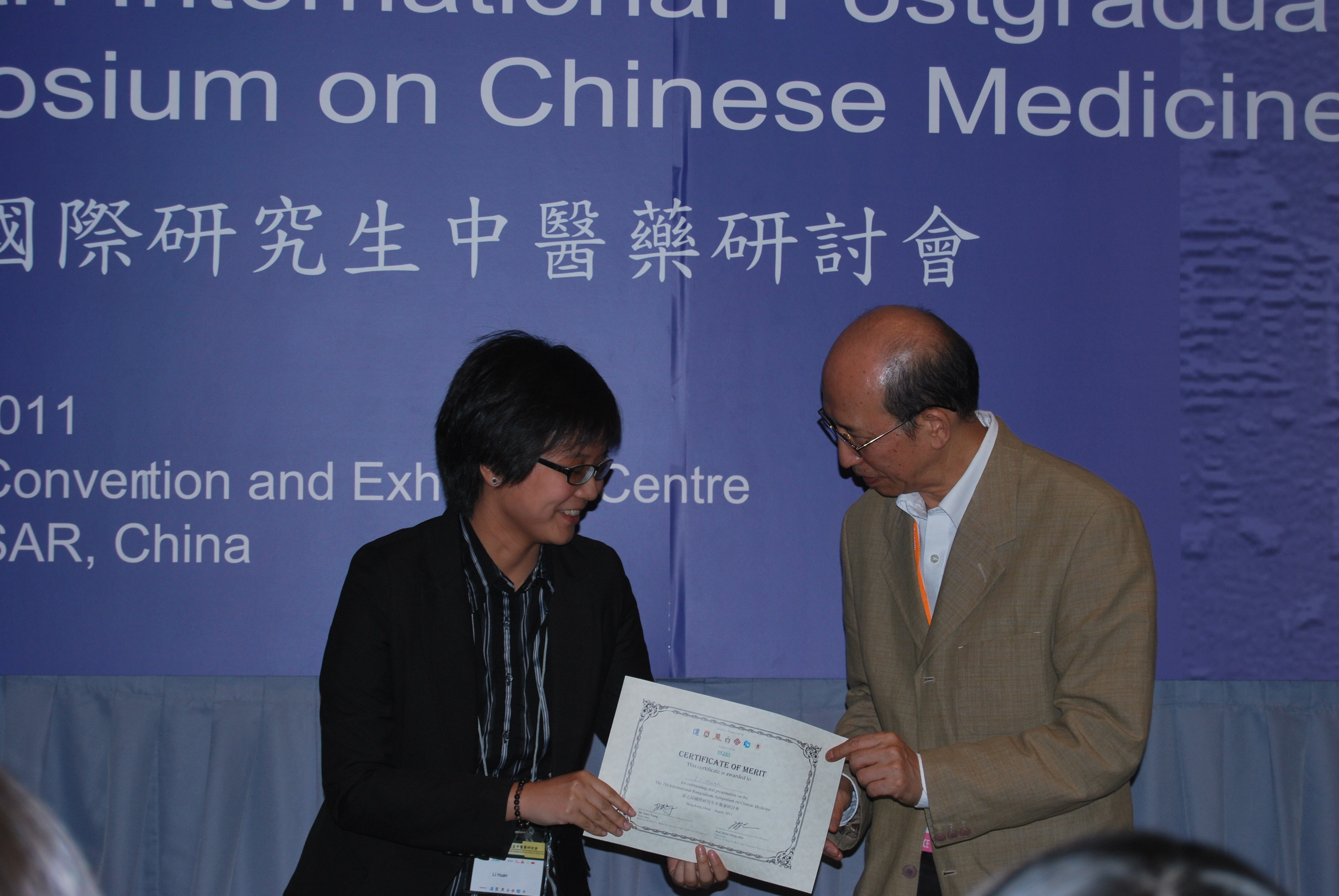 研讨上,香港李锦记健康产品集团高级副总裁及现代化中医药国际协会会长杨国晋先生、国家中医药管理局副局长李大宁、中国科学院院士及香港浸会大学校长陈新滋院士等领导分别致辞。大会从100多篇论文中选出较为优秀的20篇作为此次研讨会的交流论文,所选论文著者需在大会上用英文进行发言(oral presentation),并与其他研究生就所做课题进行讨论,我校博士生李嬛的论文《pH区带逆流色谱分离纯化马钱子中马钱子碱和士的宁》被大会选中,其本人亦上台做英文发言。她表达流畅,ppt内容丰富生动,被主办方选为最佳演讲者(best oral),并由知名教授颁奖给予奖励。