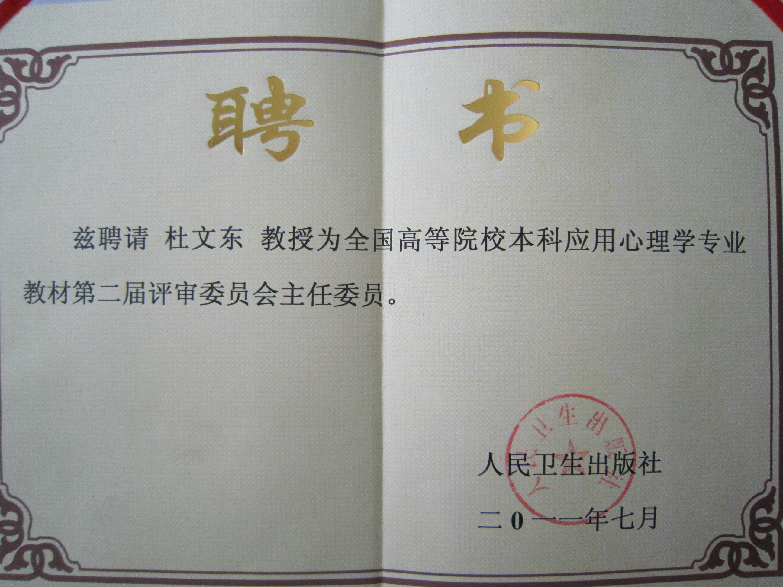 日前,我校心理学院杜文东教授接受人民卫生出版社杜贤副社长聘请,担任全国高等院校本科应用心理学专业教材第二届评审委员会主任委员,负责全国高等院校应用心理学系列教材(第二版)的组织与编写工作。